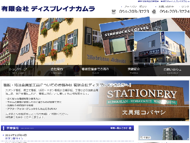 静岡県静岡市駿河区西脇977-1 TEL 054-203-3723 FAX 054-203-3724 ホームページ http://www.display-nakamura.com/ 看板・特注金属加工品についてのお悩みは有限会社ディスプレイナカムラへ! スタンド看板、野立て看板、LED・ネオン看板から掲示板、手摺などの装飾金属加工品、特注金属加工品など、看板以外のことに関してもご相談いただけます。 ・古くなった看板を取り替えたい ・ちゃんと業者に依頼したので違うものが出来てきた ・見積もりの内容が不明瞭 ・アフターフォローがしっかりしたところがいい 先ずは、どんな些細なことでもお気軽にご相談ください。 お見積もりも無料でさせて頂きます。
